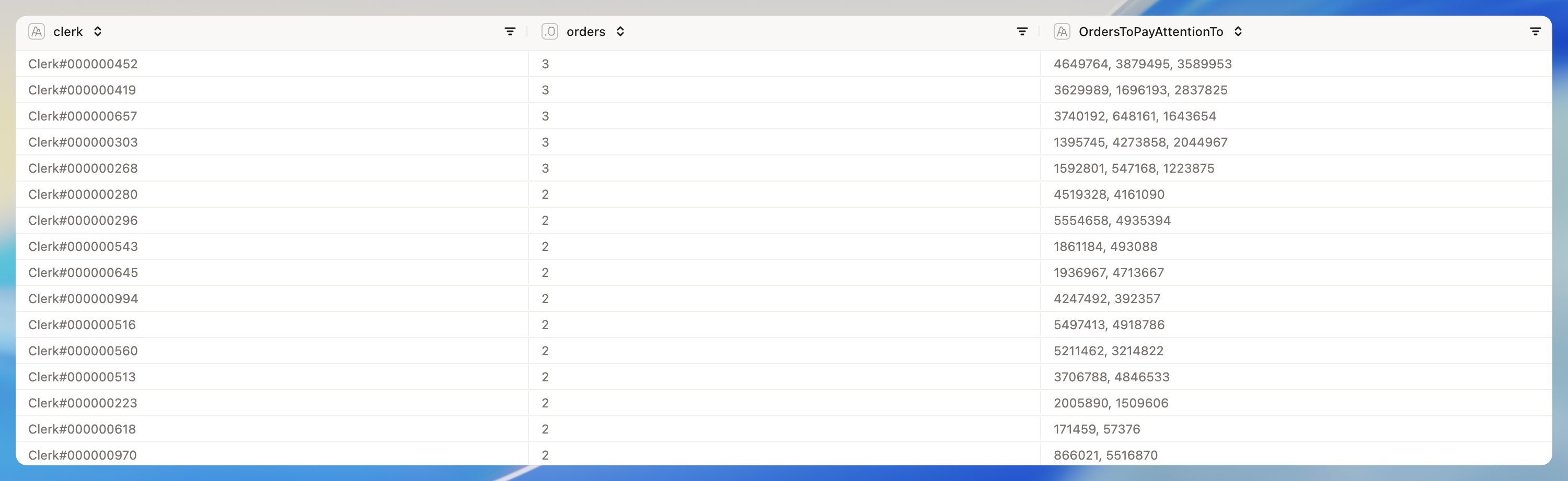 - We want the data to be sorted by the number of orders to pay attention to, descending.