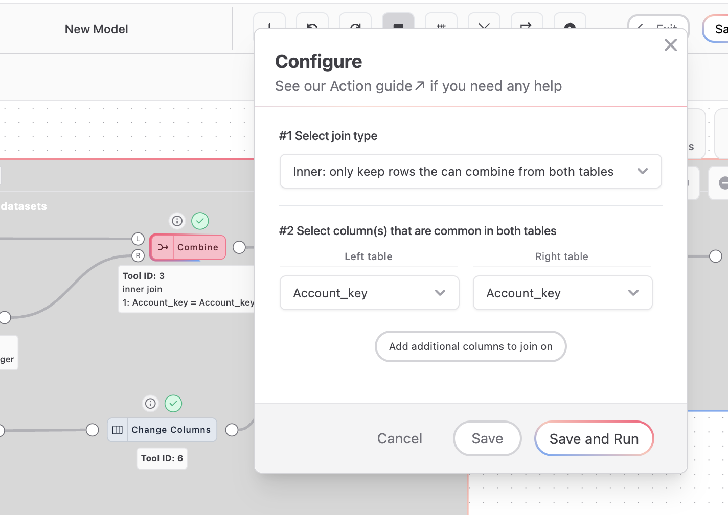 You want to use the Combine tool twice where you create an Inner join on the account_key and territory_key. The configuration of the first Combine looks like this.