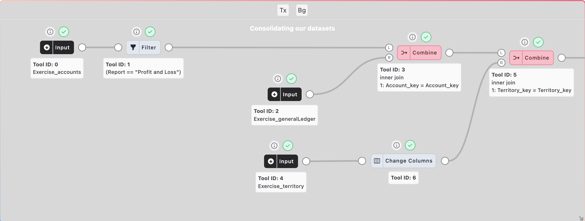 The first step you need to complete is merging the datasets together. You need information from the accounts table which contains the text description of the account (e.g. 210 = Sales, 360 = Rent, etc.). Similarly, you want to add the text description for the territory (e.g. 1 = USA). This beginning of the workflow looks like the below.
