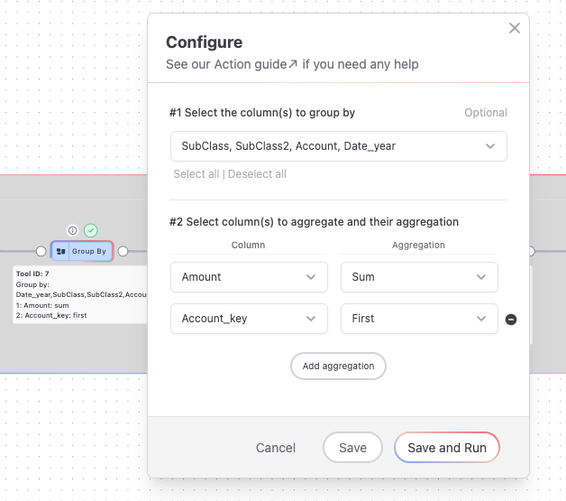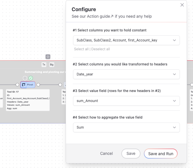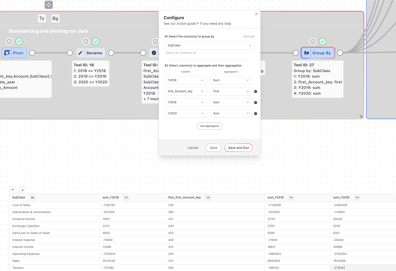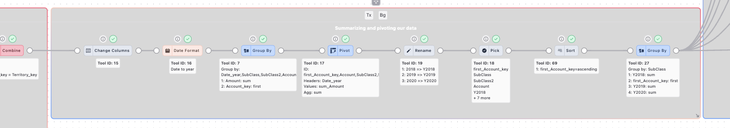 The key parts of this step of the workflow are the two Group By’s and the Pivot. In Tool ID 7, we group our transactions by date_year (created in the Date Format), Subclass, Subclass2 and Account while we sum our amounts and take the first of our account_key (for sorting later). The config looks like this: