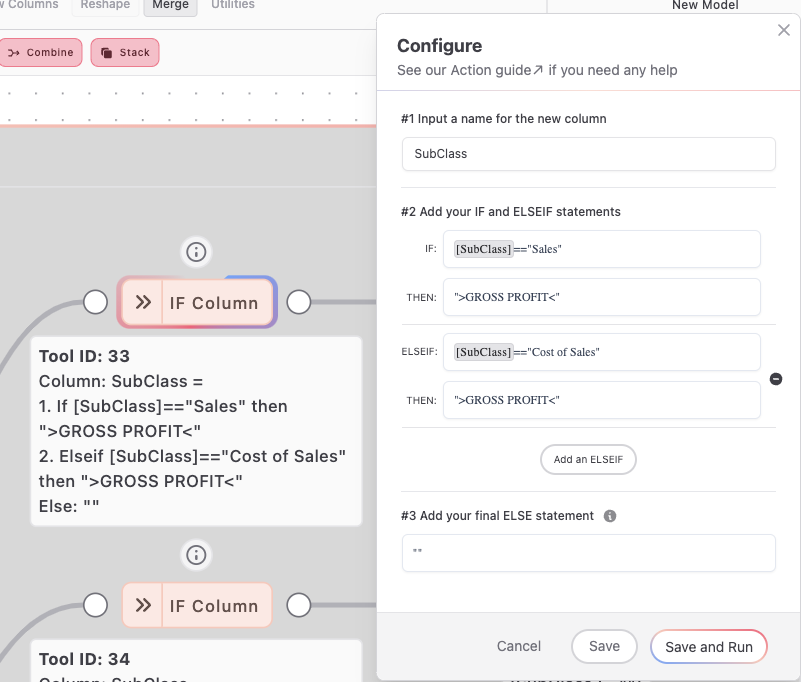 The IF Column tool is the tricky part here. We essentially replace the content of the SubClass column. We do this by saying if the subclass column is equal to “Sales”/“Cost of Sales” then label the Subclass column “