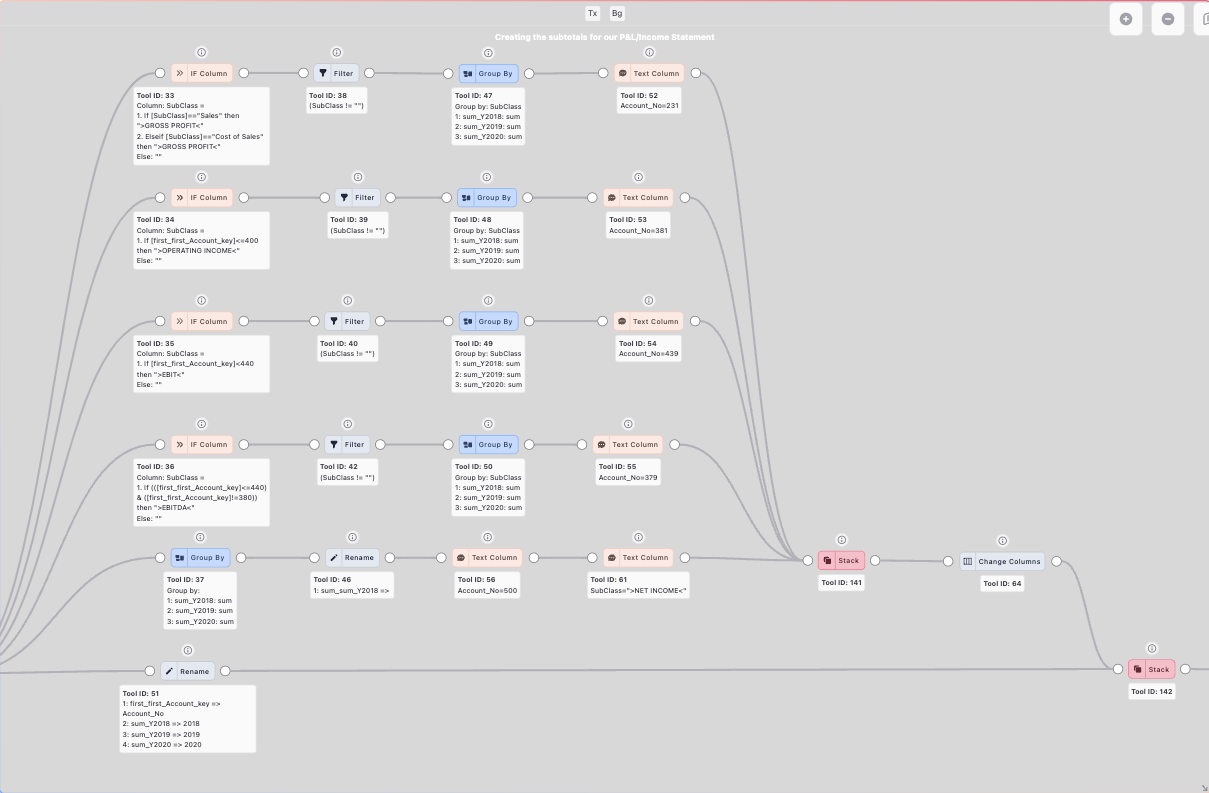 In the most complex step of our analysis, we need to create the helper lines of our Income State (e.g. >GROSS PROFIT< ). We do this by creating five streams of data to create each of the 5 helper lines. The sixth stream (the one at the bottom) contains our entire income statement without the helper lines. You entire step looks like this: