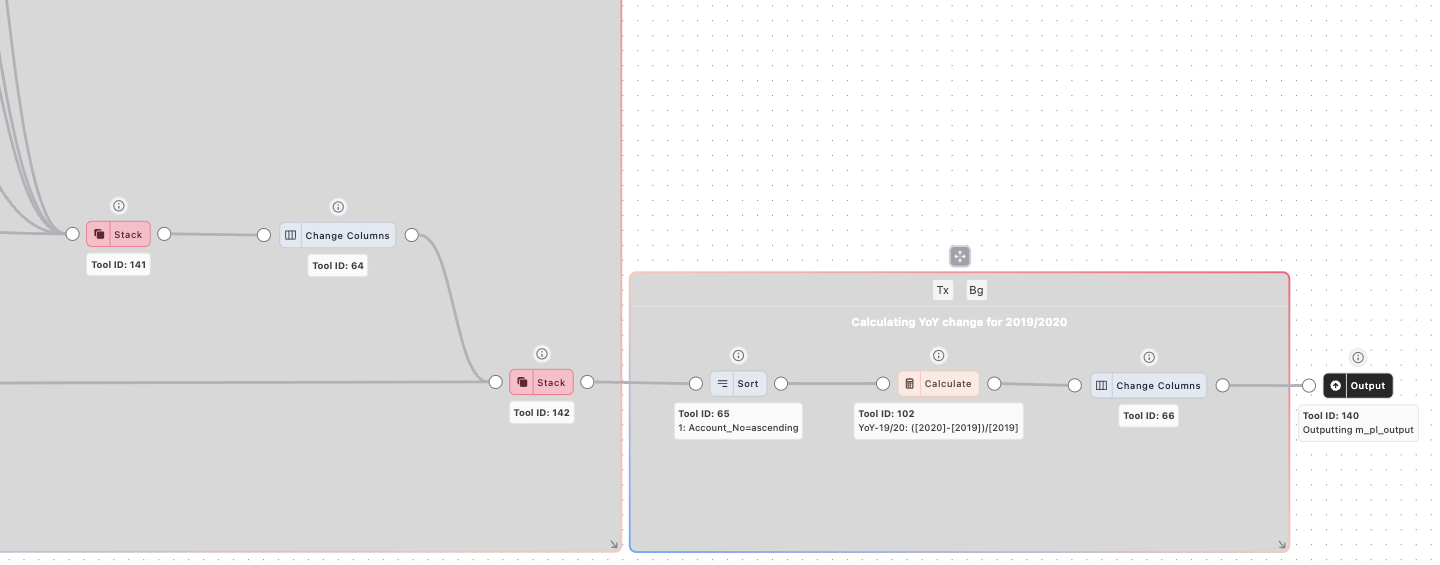The last step is easier. We simply sort by our account_key to make sure the accounts are in the right order, calculate the YoY difference with a Calculate tool and use a Change Columns to tidy up our data set.