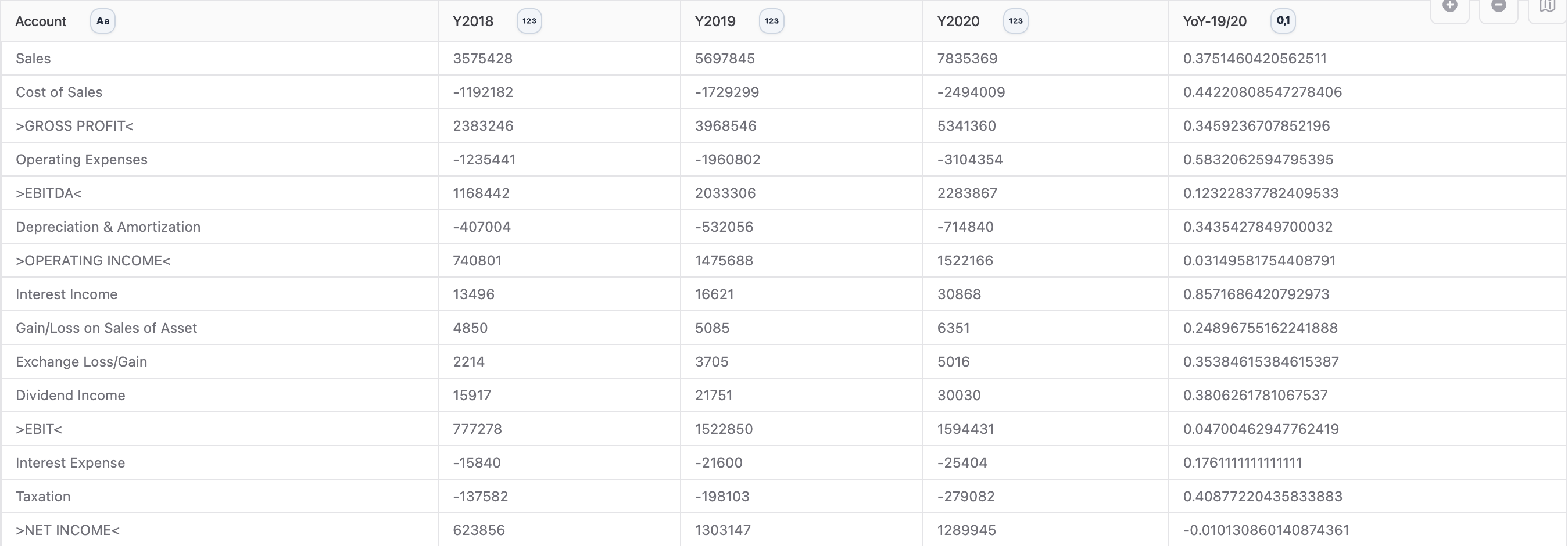 We have a couple of helper rows in our Income Statement - Gross Profit, Operating Income, etc. Essentially, all the rows in >CAPS LOCK< - we’ll define each of these below.- Gross Profit: sales - cost of sales