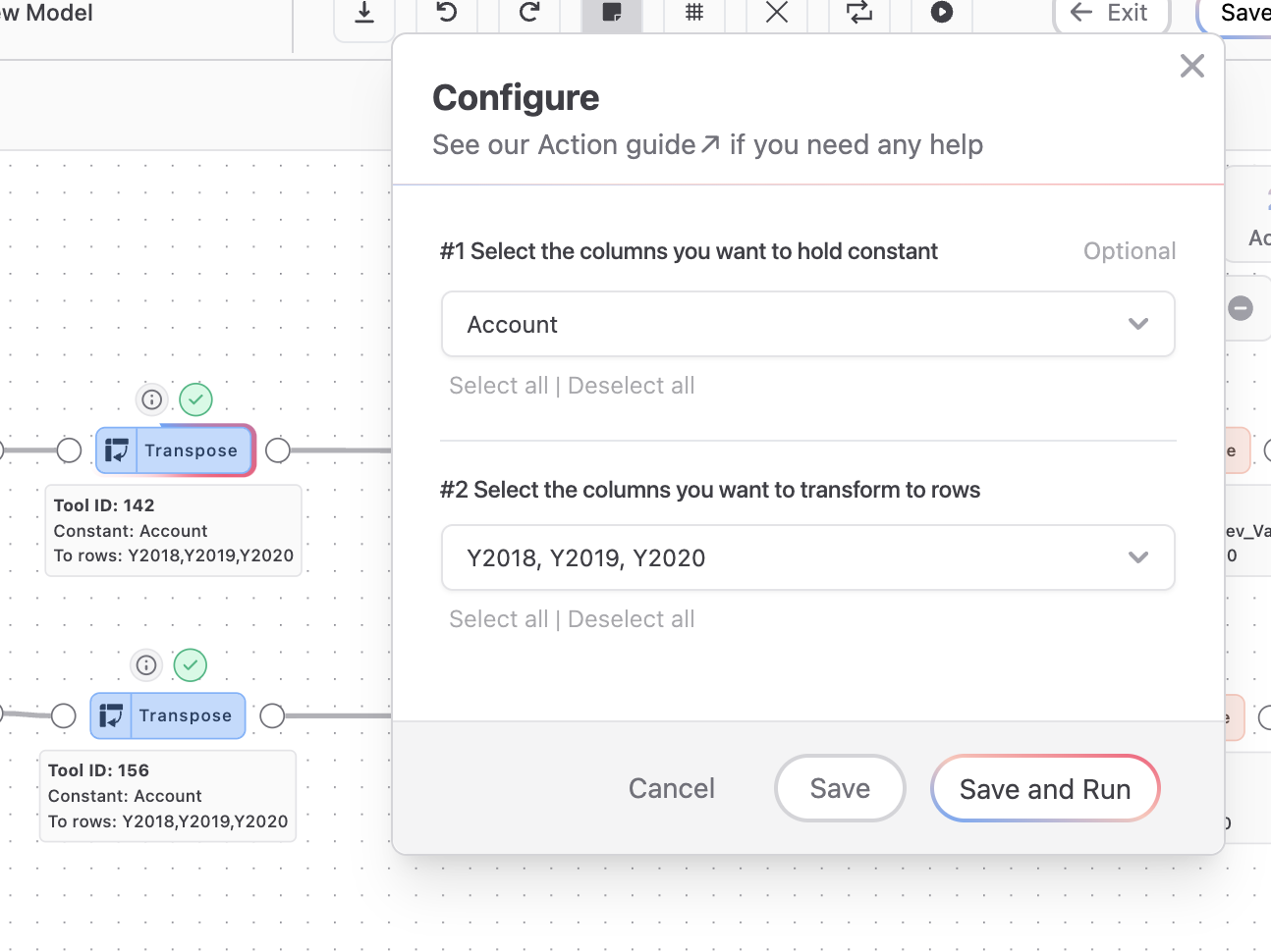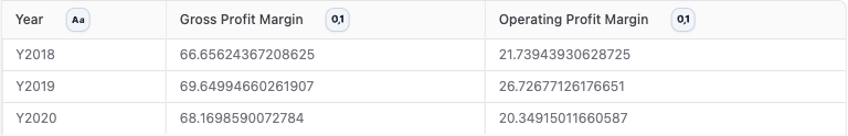 In Part 2 of this exercise, we’ll work with the output from Part 1. If you’re up for it, save the table from Part 1 as a table with the Output action and input it in a new model. The objective is to create a table identical to the one below. It showing each year as a row with a Gross Profit Margin and an Operating Profit Margin. We did it in 20 new actions. You might want to take a look at the Transpose and Compare action.