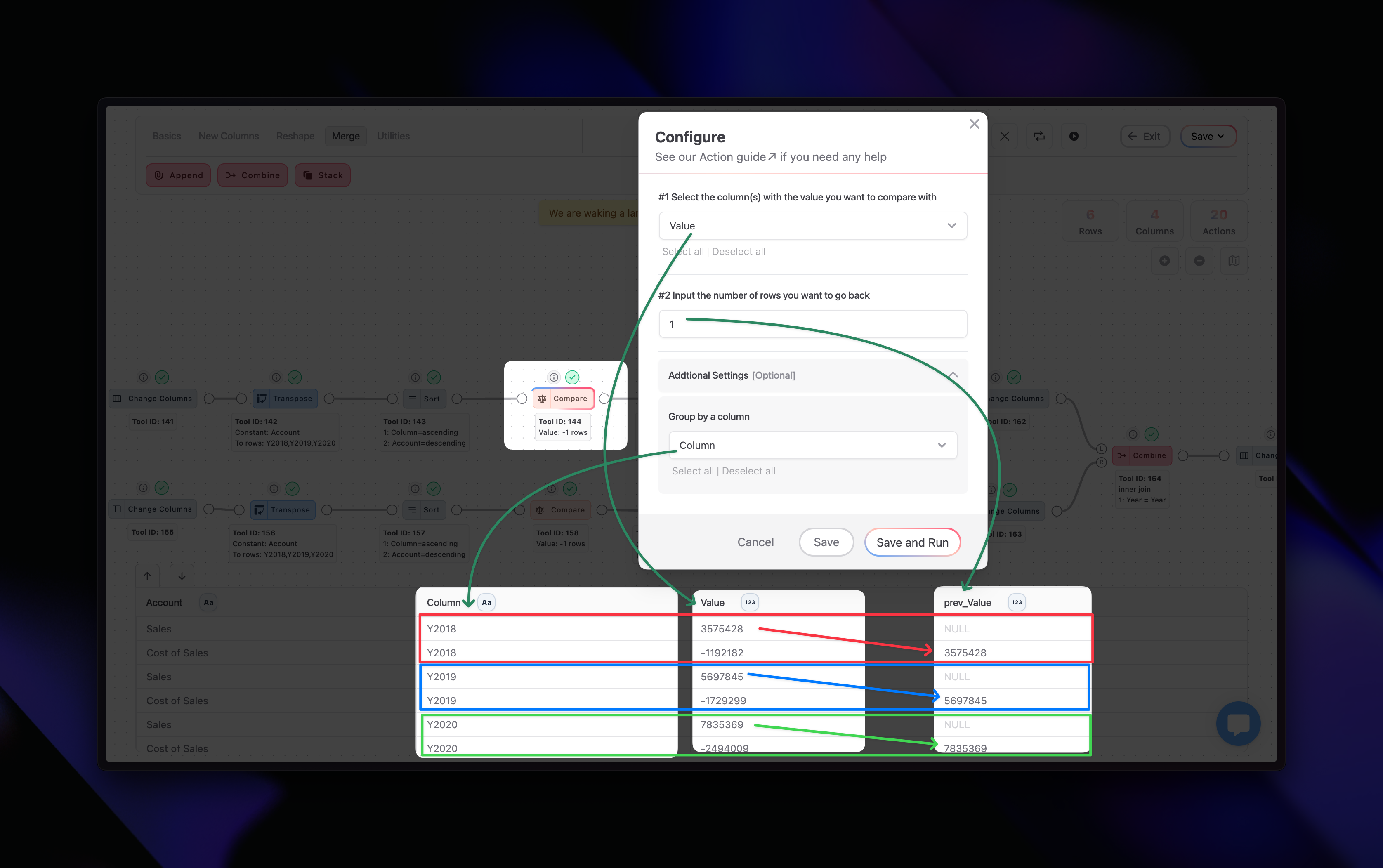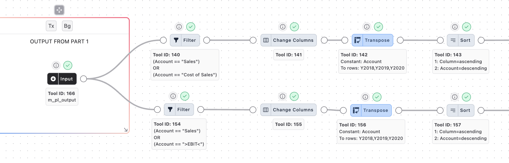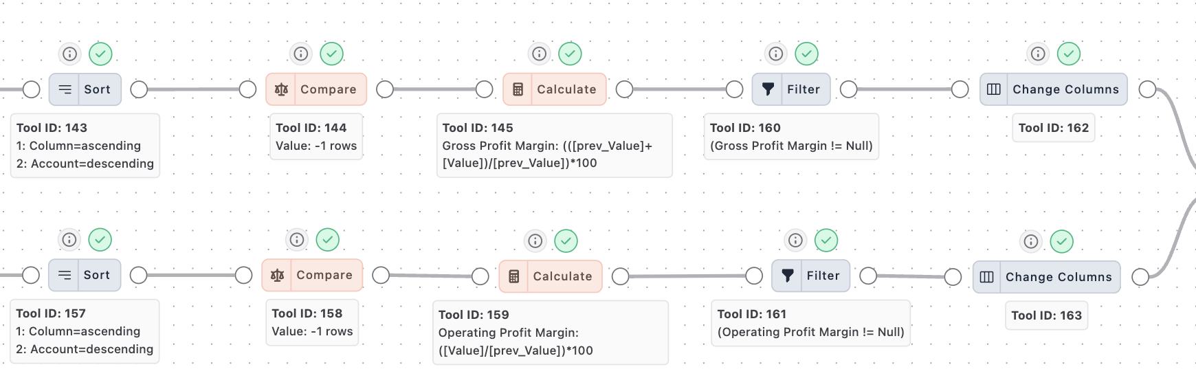 Let’s begin with the output column prev_Value. This one is fetching the previous cell of the column Value. So the number from Value column on row 1 will show up in the number of prev_Value on row 2.We also use the addtional setting “Group By” to reset our calculation everytime we see a new year in the column Columns. In doing so, we move the Sales and the Cost of Sales to the same row - and now we can calculate with it!The calculations - Tool ID 145 and 159 - are faily simply. You can see the formula in the first screenshot here. Afterwards we remove the rows without any calculation with the Filter tools.