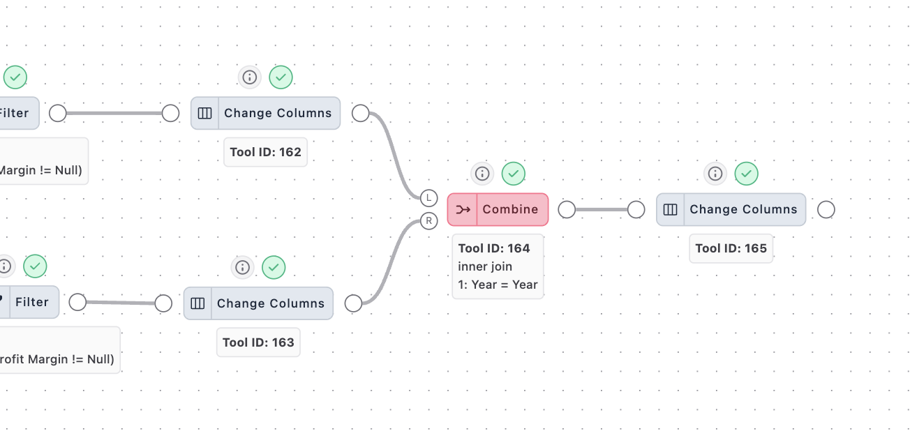 The final step we simply use a Combine tool to merge the two streams of data back together. We Combine using an Inner Join on the Year column. It looks like this: