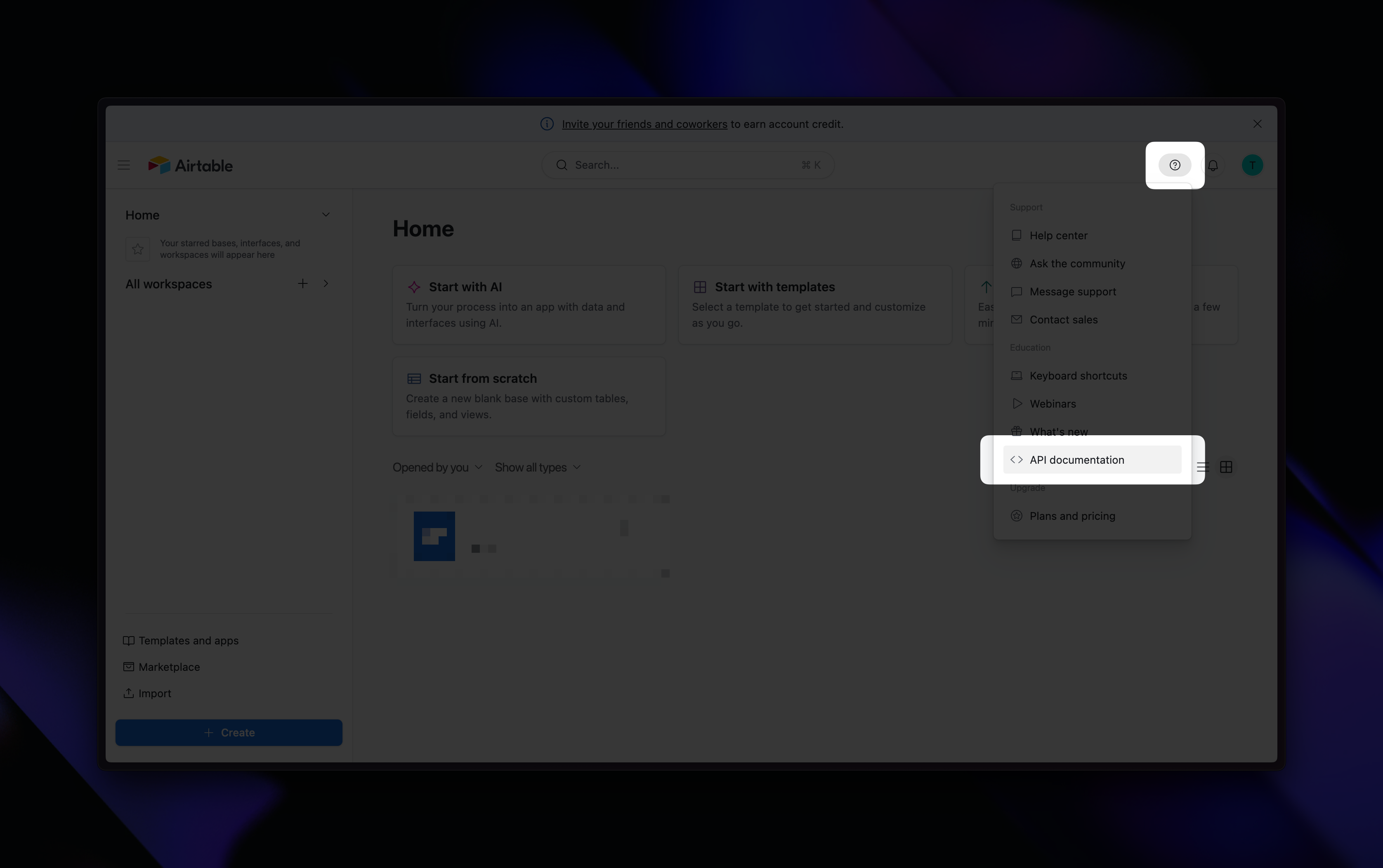 Help → API documentation → click on the base you want to extract data from → copy the ID.Find Base ID from API Documentation