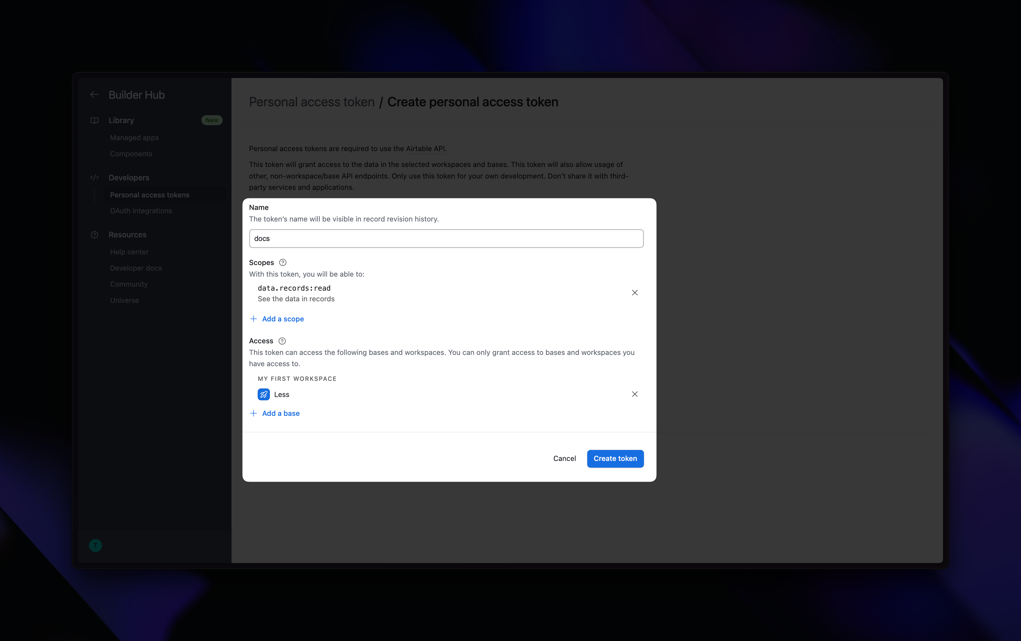Go to this url: https://airtable.com/create/tokens/new and create a new token. Input whatever name you prefer and set the settings according to the below.