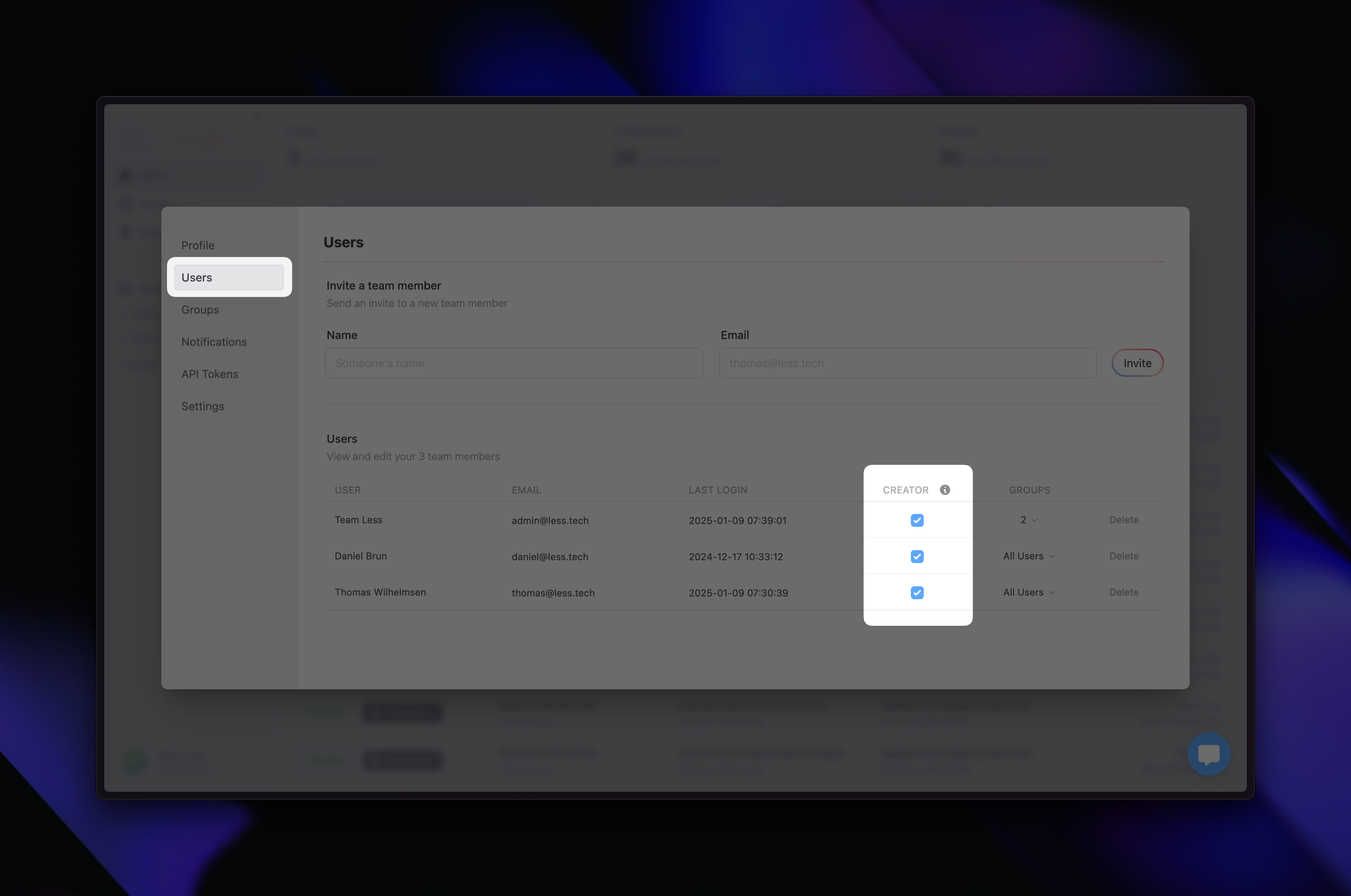 - The Creator group can create new connections and models. The Creator attribute is controlled from the Users tab in the settings modal.