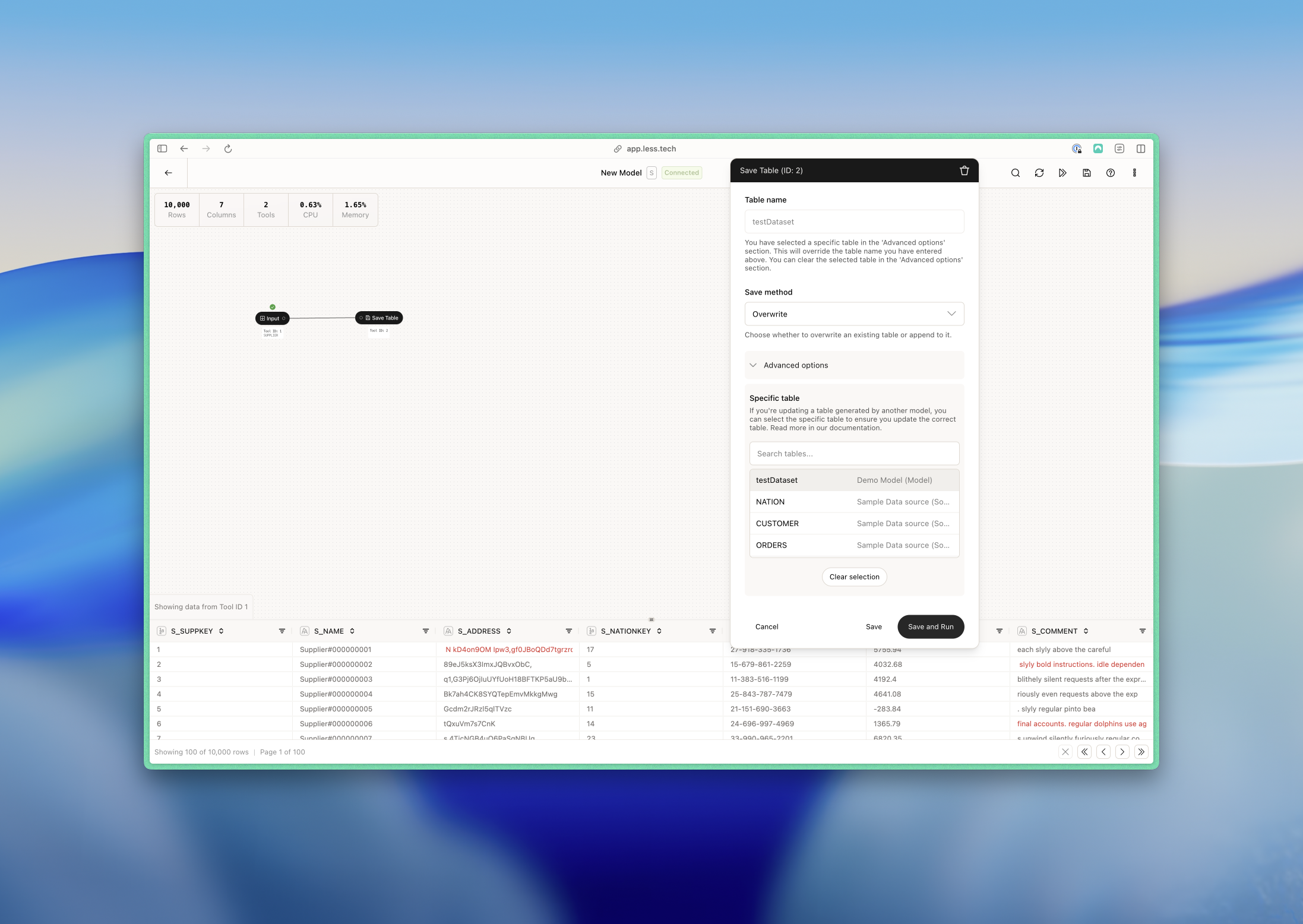 You table is stored in file-storage hosted by Less. This is a fast and efficient way to store tables inside Less that we opt for because its optimized for data analytics. If you’re an Enterprise customer, you can choose to self-host the file-storage. Reach out to us if you want to learn more about this.Advanced options