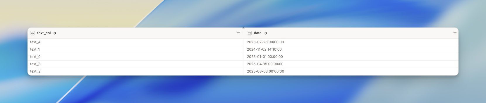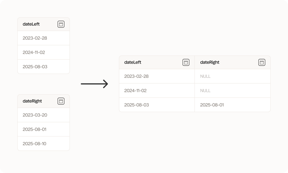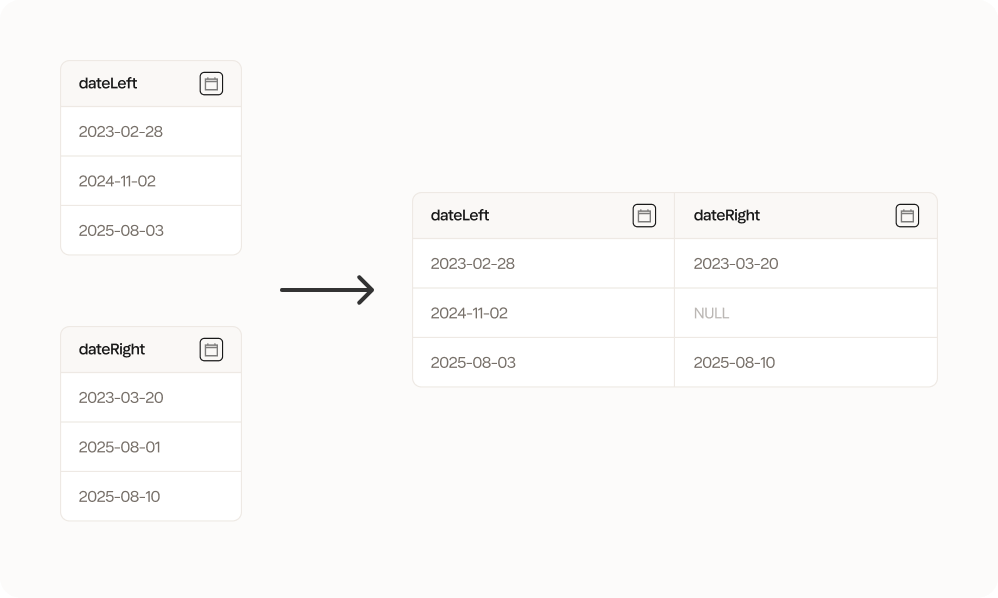 In this example, we want to first combine on the text_col from the left dataset to the joinBefore from the right dataset. This will act as a filter to only combine the rows where the text_col is the same as the joinBefore column. We also use the nearest strategy with a tolerance of 90 days.- Left dataset