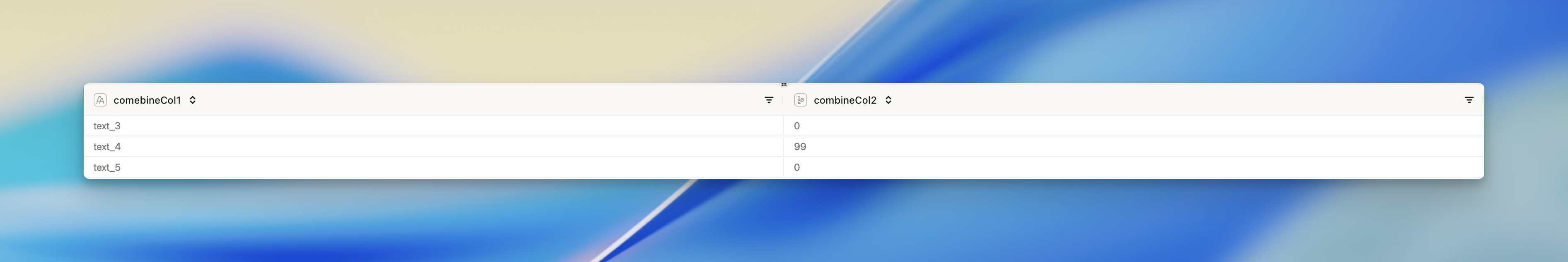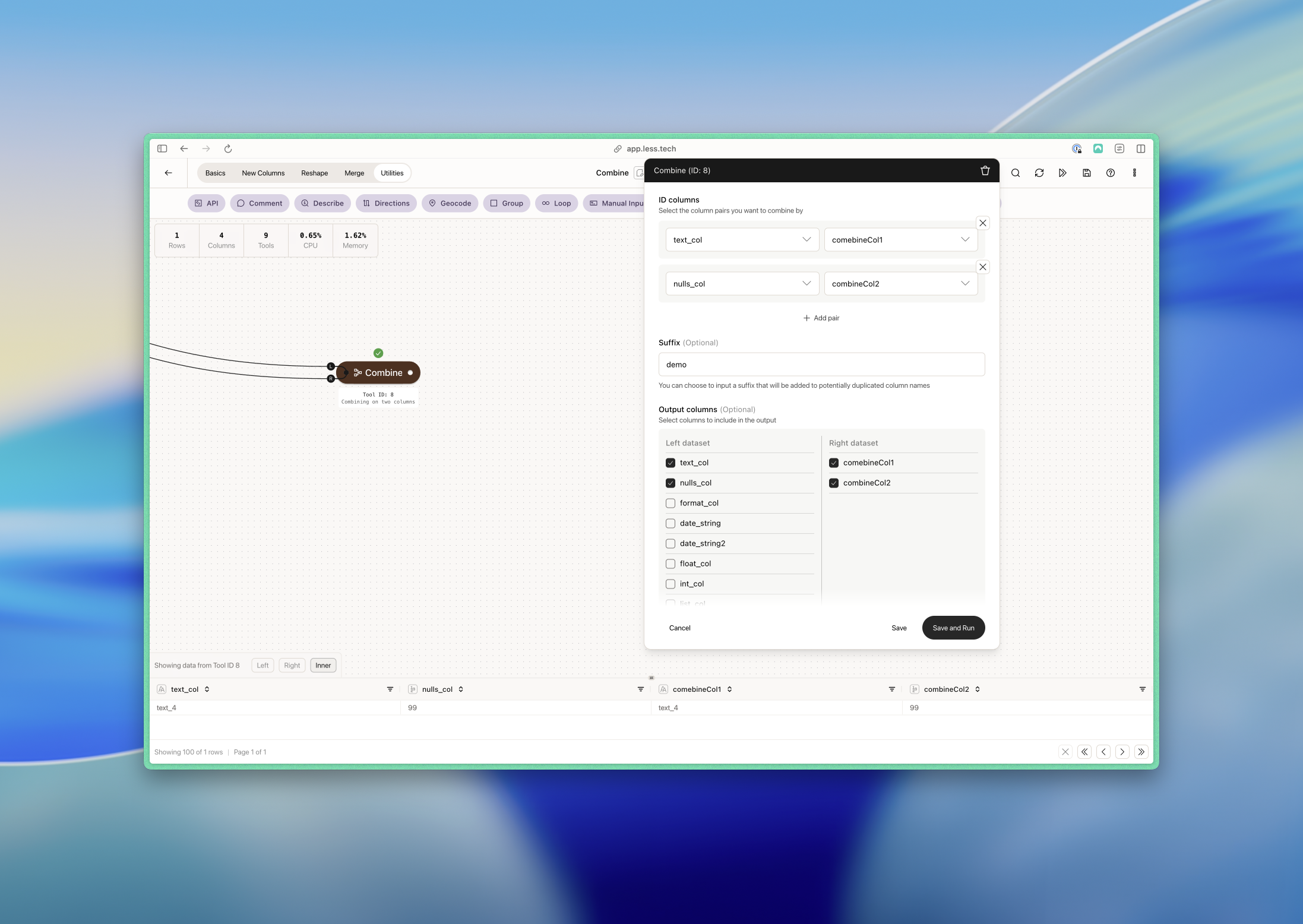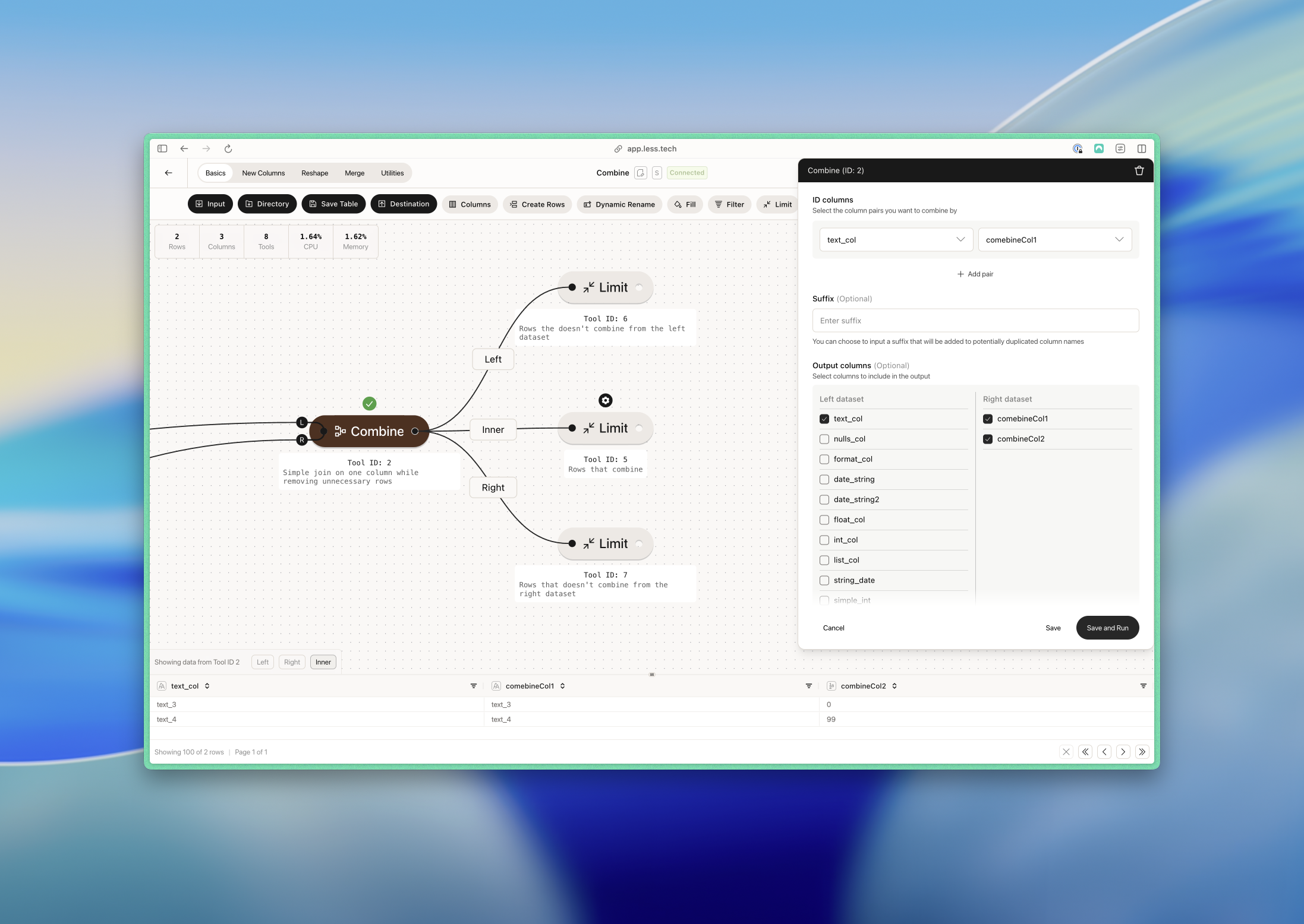 Here we have a simple example where we want to combine on text_col (L) and combineCol1 (R). We deselect a lot of columns from the left dataset while we’re at it.- Left dataset