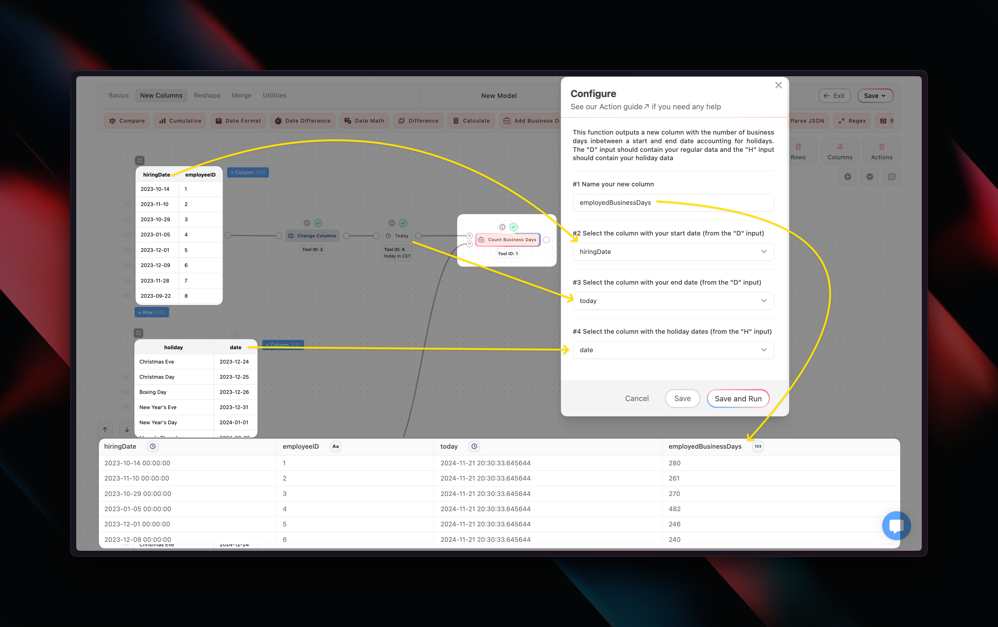 The Count Business Days tool consists of four required input. You need to connect your primary data to the D anchor and the dataset containing your holidays to the H anchor. Check out the examples for a reference.1