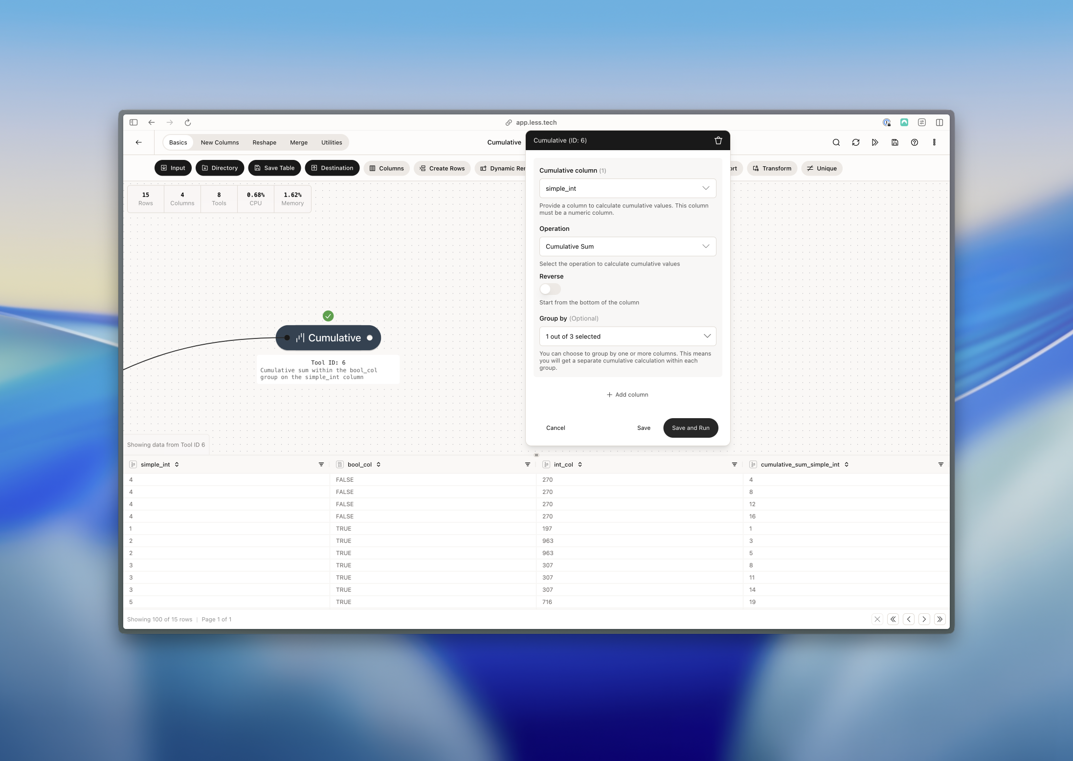 This is an optional input. You can choose to group the cumulative calculation by a column. For instance, if you want to calculate the cumulative sum of the values of the column by a month column.