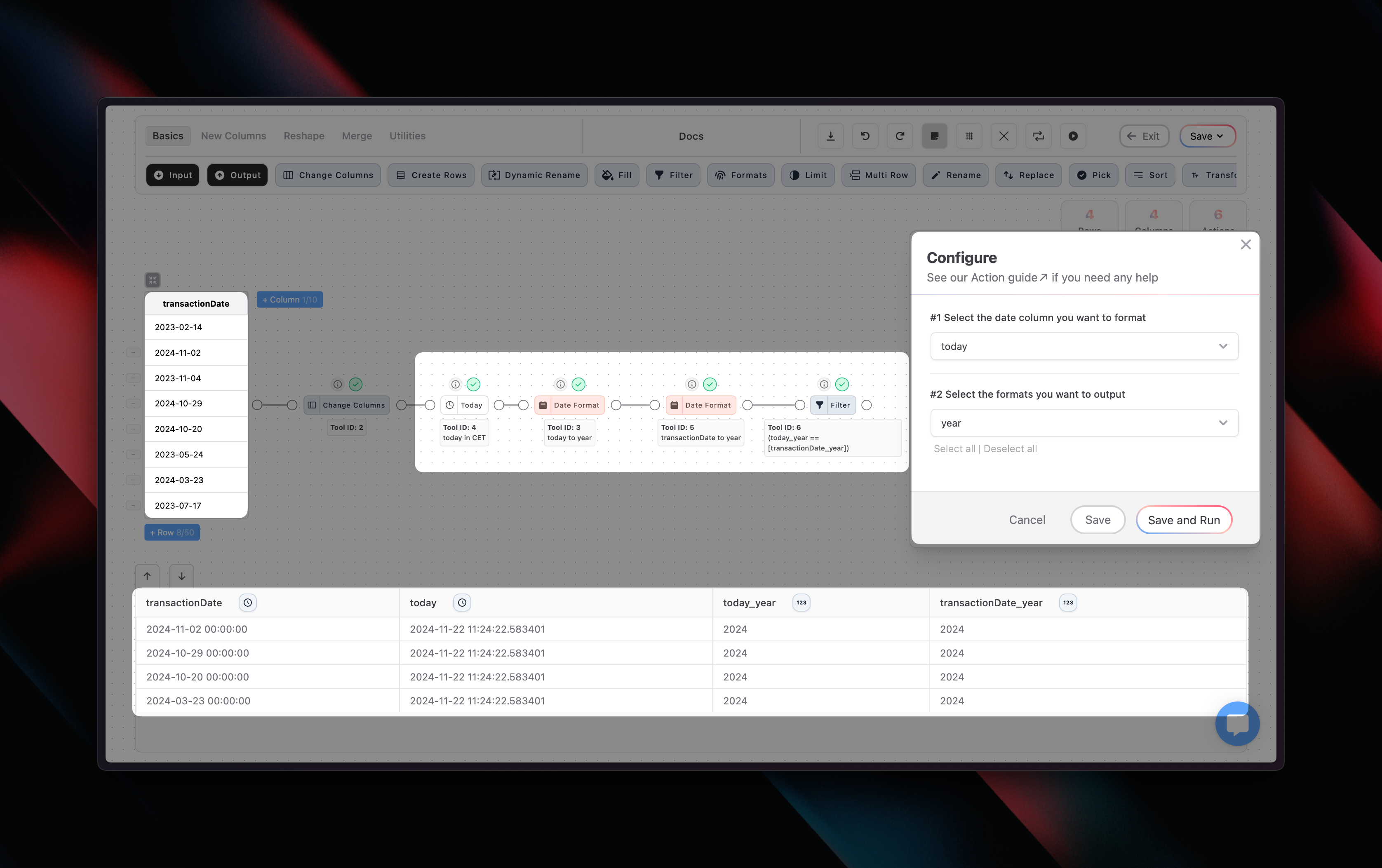See how we use the Today to generate a dynamic current timestamp. Then we use the Date Format to extract a year from both our transactionDate and today column. Lastly, we add a Filter that only keeps the records where the year of today and of the transactionDate are the same.