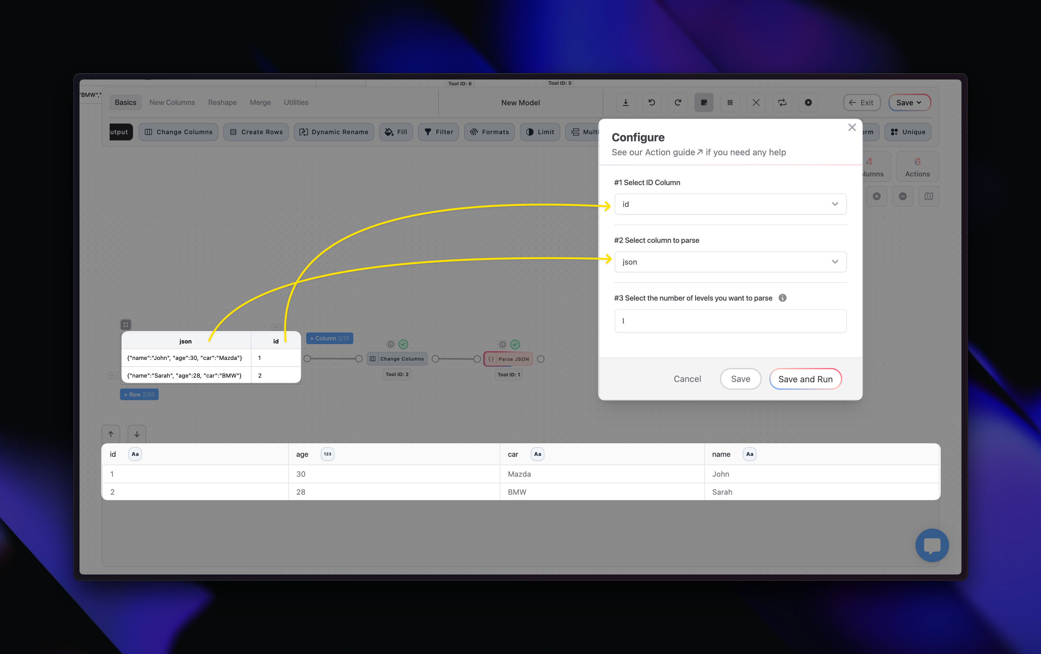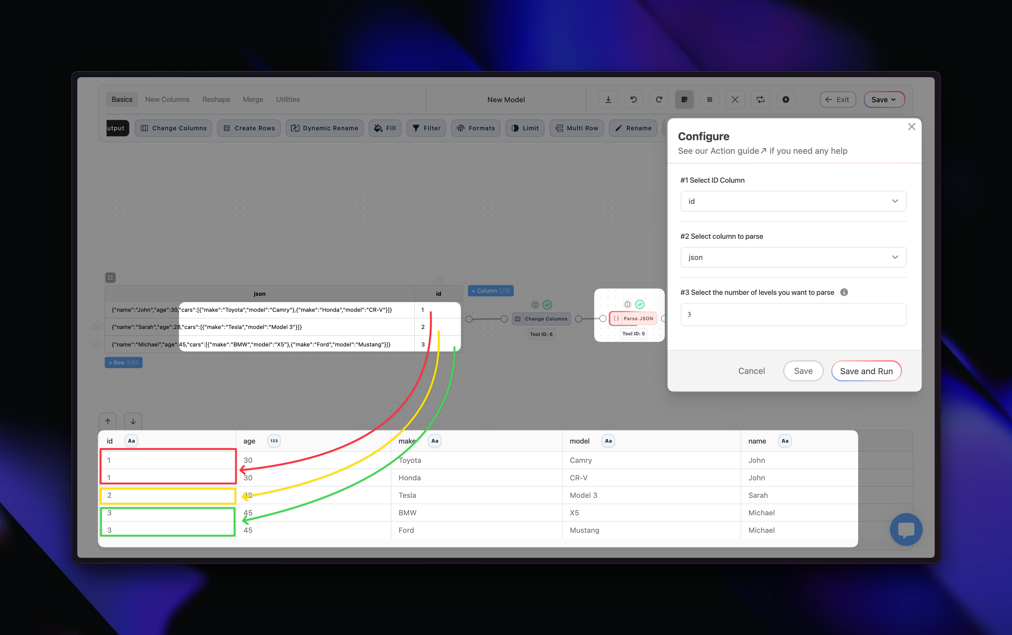 If your JSON contains nested JSON (see examples below) it can create multiple rows for each unique row. To identify unique row, you have to select an ID column. Use the Row ID tool to generate one if you don’t have it in your dataset.