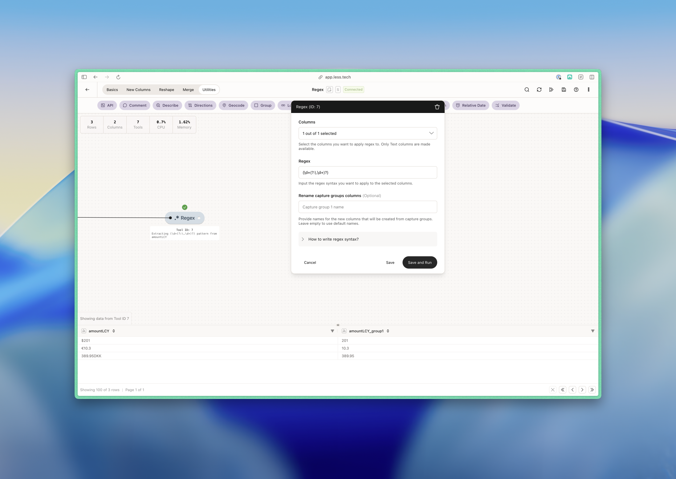 In this example, we want to extract the numbers from a currency column that contains currencies. We use the following regex statement:(\d+(?:\.\d+)?). To translate: