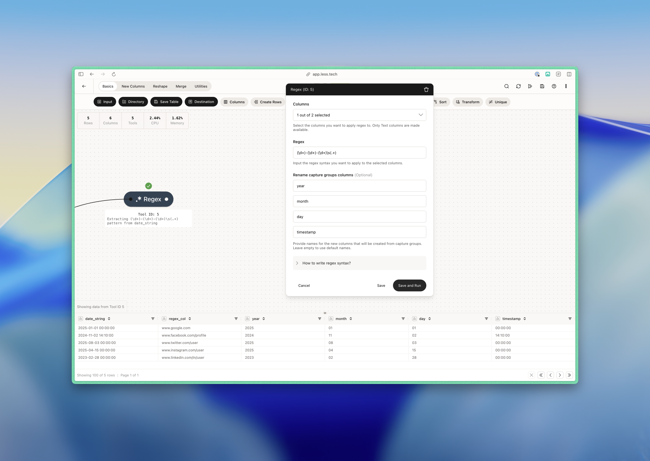 In this example, we want to separate the year, month, day and timestamp into separate columns with RegEx. We use the following regex statement:(\d+)-(\d+)-(\d+)\s(.+). To translate: