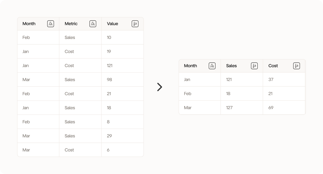 Generally speaking, the Pivot is useful for transforming the shape of your dataset. Whenever you have a type, metric or category column that consist of different dimensions, you can “flip” that column to be headers instead of rows.Examples