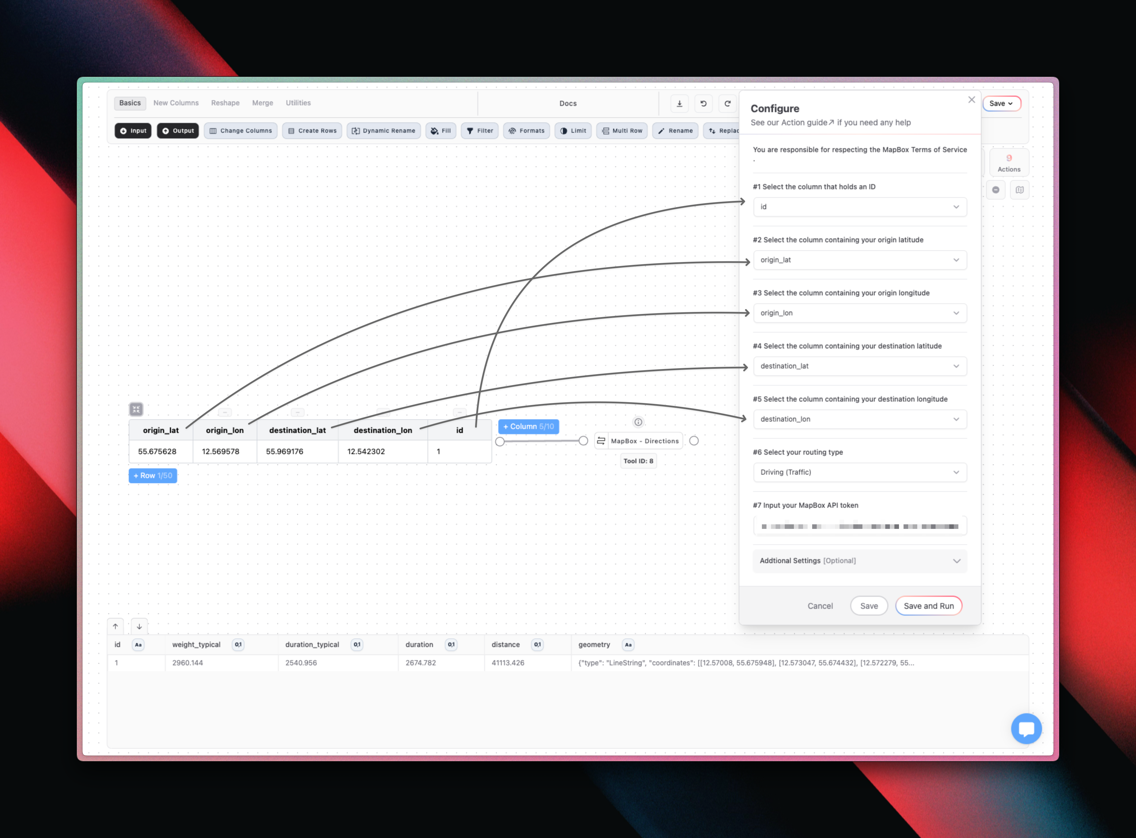 You can use the output from the Mapbox - Directions tool for a wide number of use cases, for instance in logistics and transportation.- You can use the distance and duration columns to track wear and tear of your vehicle fleet