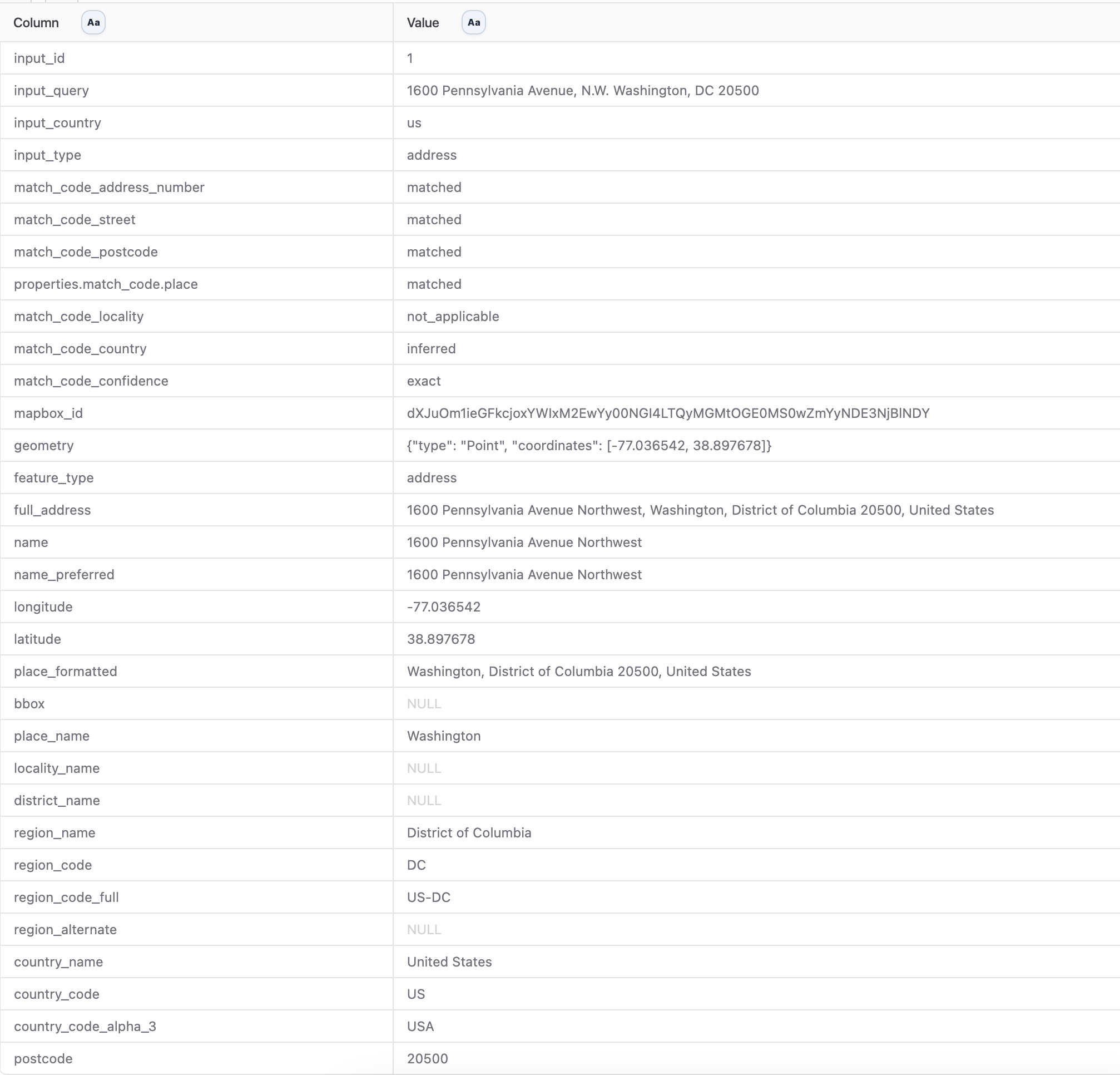 MapBox can output multiple options if it’s not 100% about which place your looking for. With this input, you can limit how many options MapBox outputs.MapBox always inputs the most probably options as the first record.