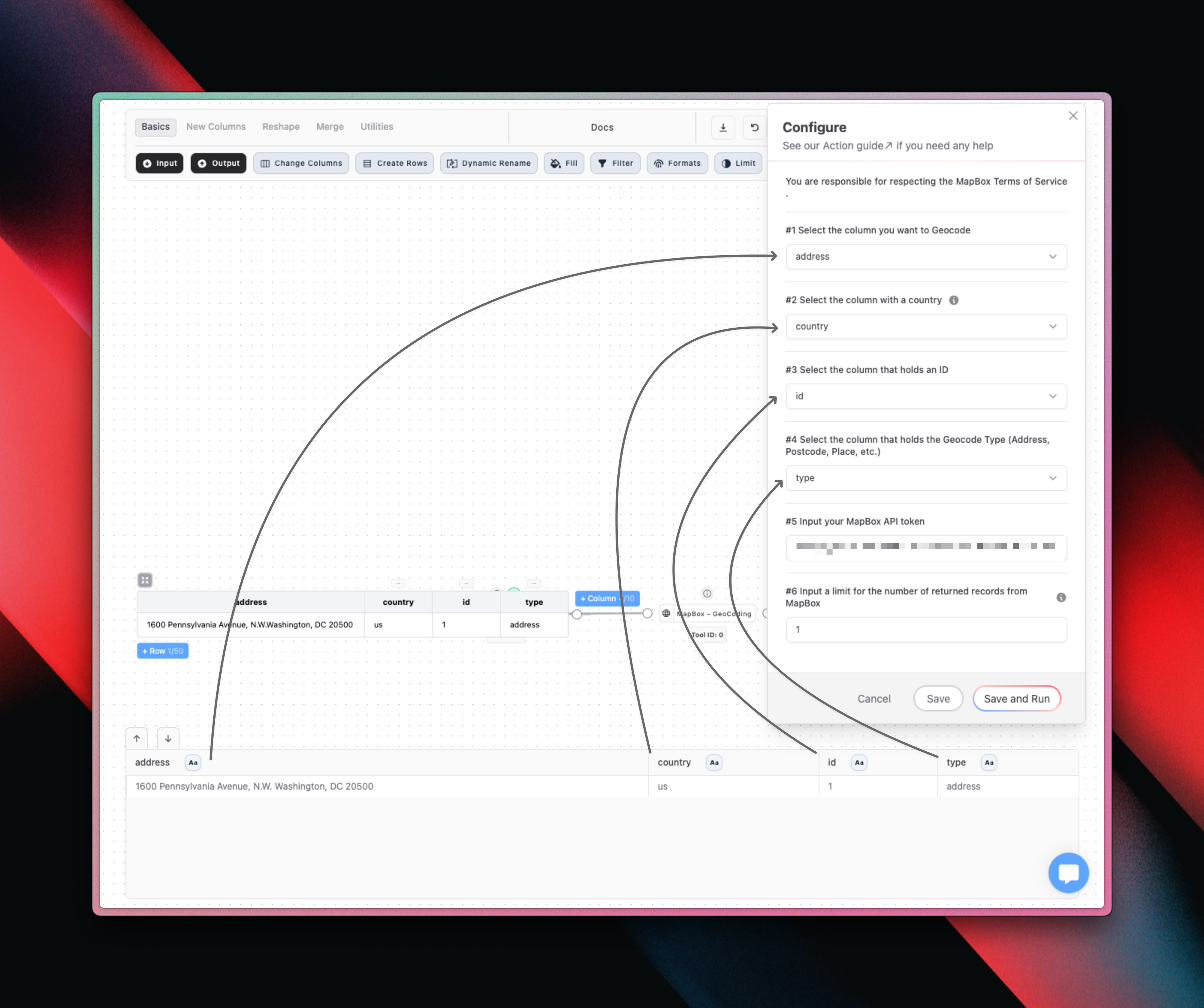 The MapBox - GeoCode tool consists of six required input.1