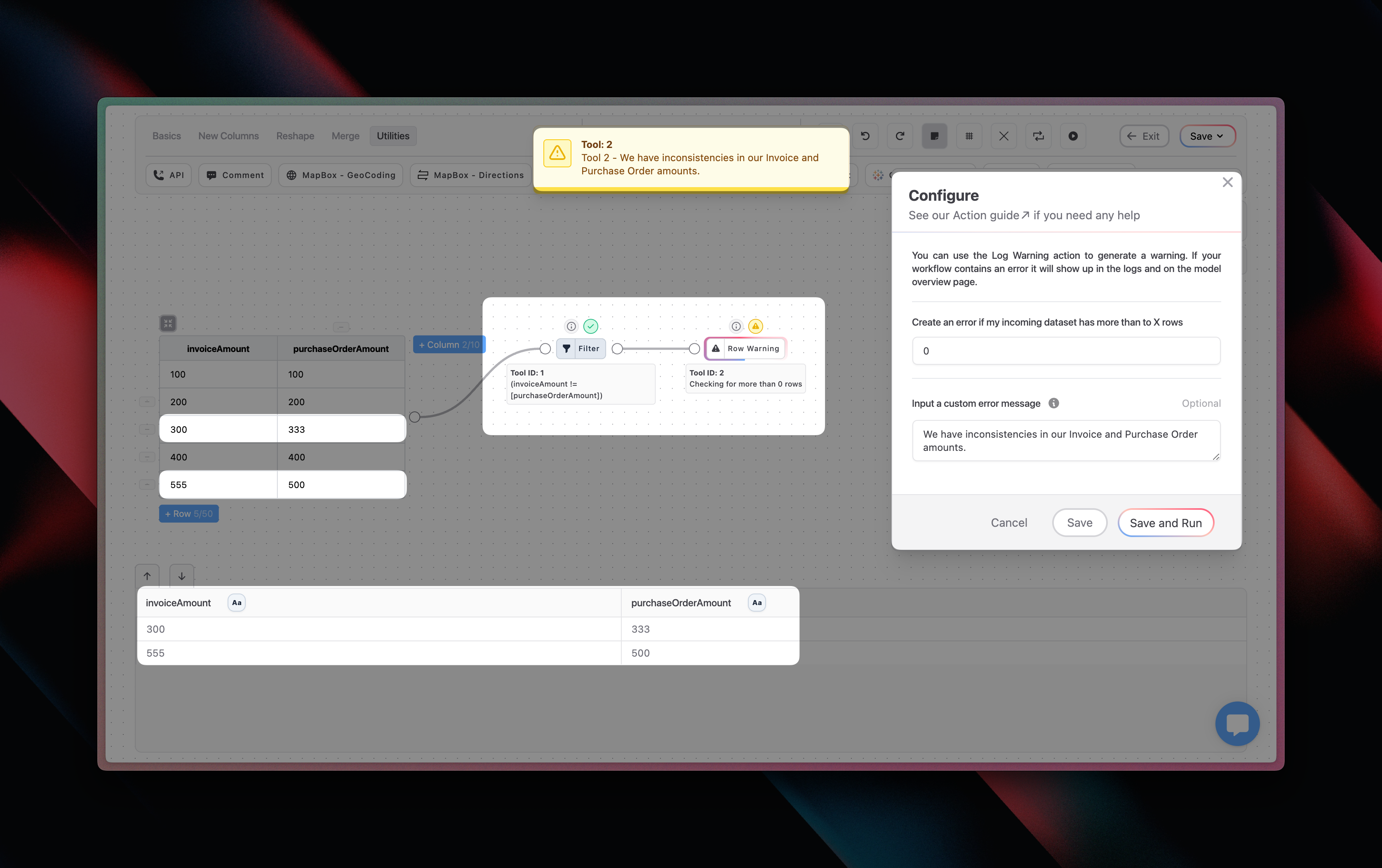 The Row Warning tool is typically used for flag shortcomings of your data or to flag certain scenarios:- It is very useful to set up warnings that inform you of data quality issues. It could be invoices with an amount lower than zero.
