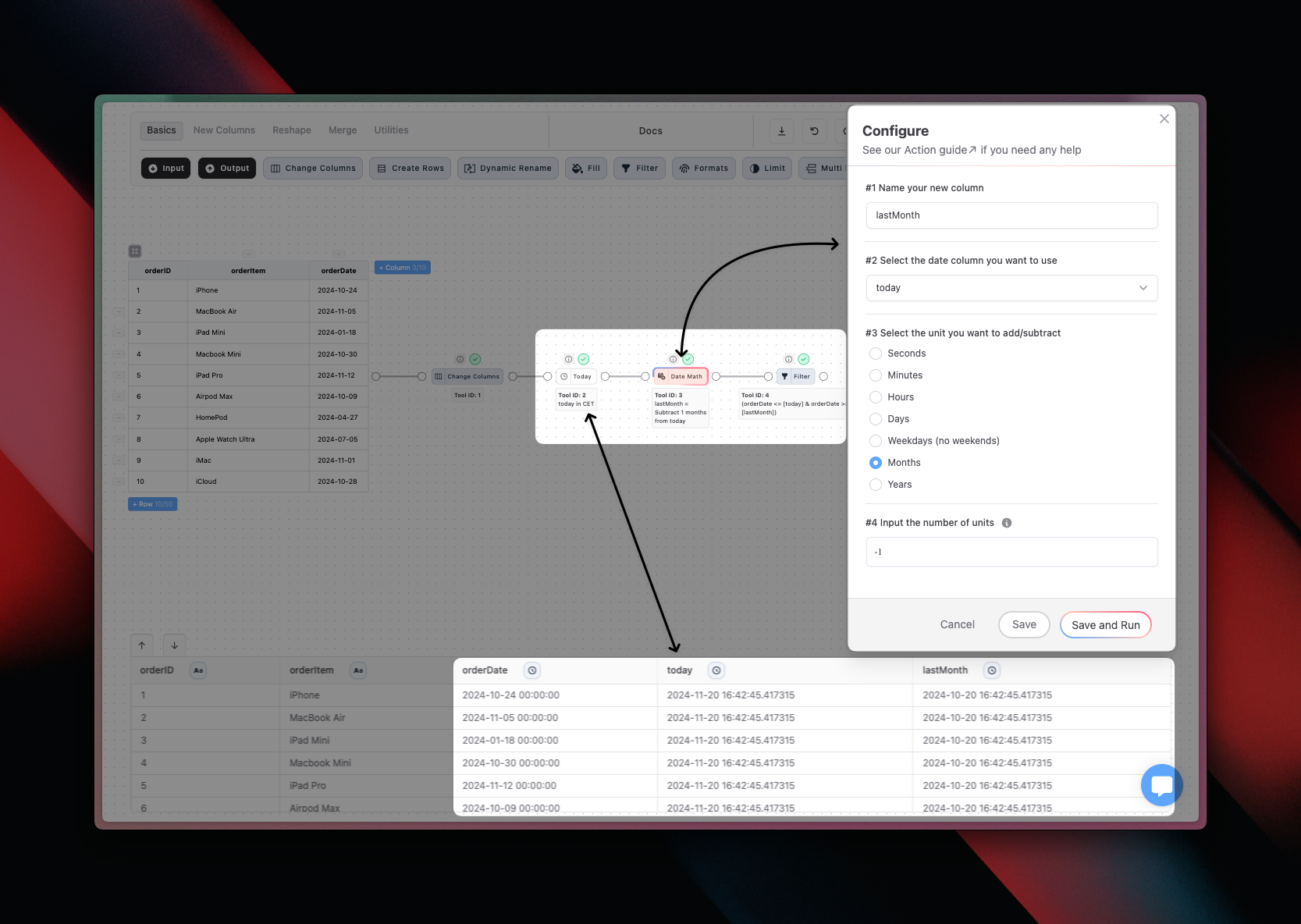 - Use the Today tool with the Date Math tool to get all the orders of the past month